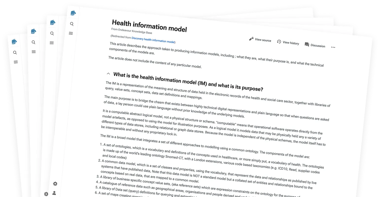 The Endeavour information manager is an extensive application and set of deployable services designed to help informaticians and software developers to understand health data, and provide utilities for data modelling, query definition, concept set definition and ontology servers.